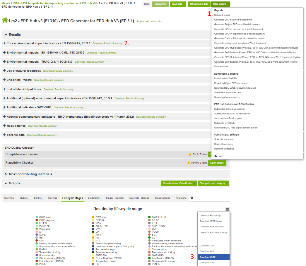 Depending on what kind of results you want to see (specific impact indicators or life-cycle stages), you can download the data from the graphs on your project page:
